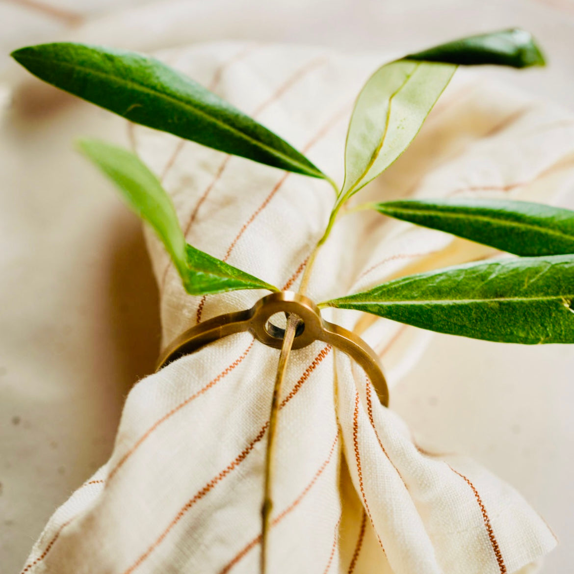 Elevate your table setting with these beautifully crafted napkin rings. Made from durable iron with a warm brass finish, each ring features a smaller decorative loop designed to hold a sprig of greenery or a delicate bloom-perfect for tailoring your place settings to any season or occasion.